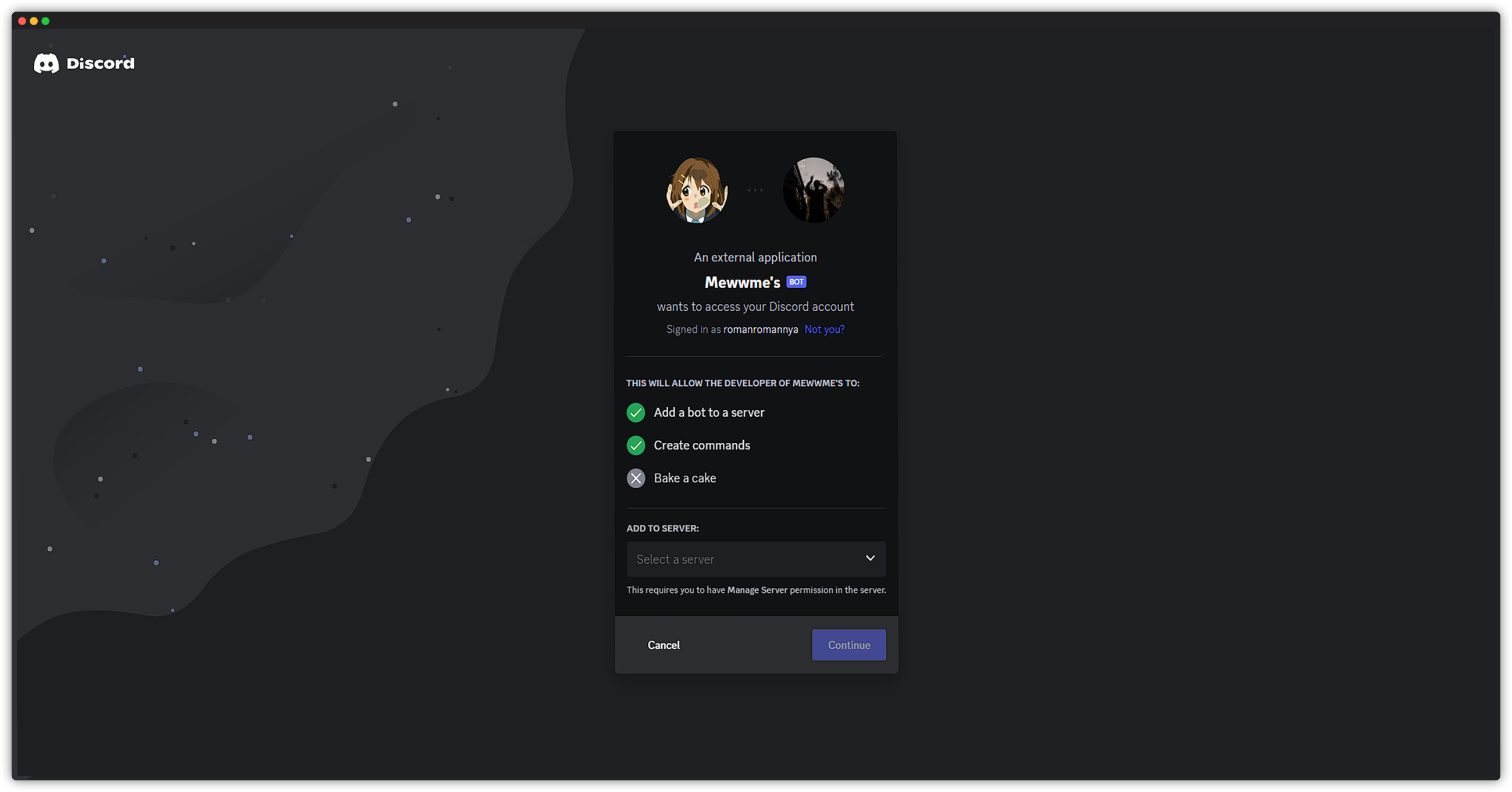 Once you've selected the server that you'd like to add Mewwme to, you can press the Continue button on the bottom right of the menu.
